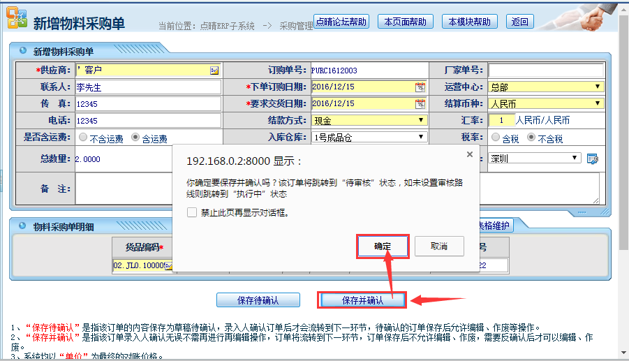 操作步骤: 采购管理——新增采购单,如下图: 操作步骤说明: 1、点击选择供应商; 2、选择结款方式; 3、选择入库仓库; 4、选择采购产品编号; 5、用扫码枪键入批号(串码) 完成后,点击保存并确认,如下图所示: 完成后,相关审核人会收到对应的审核提醒邮件; 操作步骤:采购单——采购单审核,如下图所示, 审核完成后,完成操作,仓库即刻增加该库存数量,如下图所示: 点晴模切ERP更多信息:https://moqie.clicksun.cn,联系电话:4001861886 该文章在 2016/12/15 9:13:31 编辑过 |