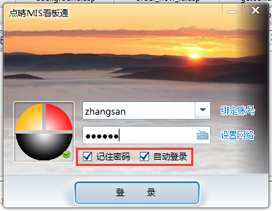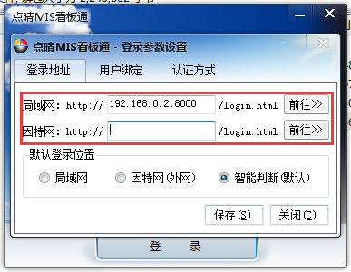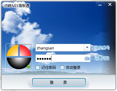 下载并将以上程序解压放在适当的位置,然后找到并打开点晴MIS看板通主程序,进入如下页面: 点击“设置网络”按钮进入到网络设置界面,网络设置分局域网和因特网,如下图所示: 点击“绑定账号”进入到账号绑定页面,如下图所示: 设置完成后,选择对应的账号录入密码登陆,如下图所示: 登陆后务必勾选“记住密码”和“自动登陆”,设置后工控机一开起就可自动登陆自动显示需展示的内容: 进入页面,如下图所示: 页面右上角有设置按钮,有“刷新页面窗口”、“系统设置”、“注销/更换用户”、“关于本系统”: “刷新页面窗口”:点击可对窗口数据进行刷新。 “系统设置”:点击可进入系统设置页面,如下图所示: 此页面设置一些基础参数,“随Windows系统开机自动启动”建议勾选开启,“开机后自动登录Windows系统”建议开启,本程序浏览器内核会强制设置为IE11。 “看板内核设置”: