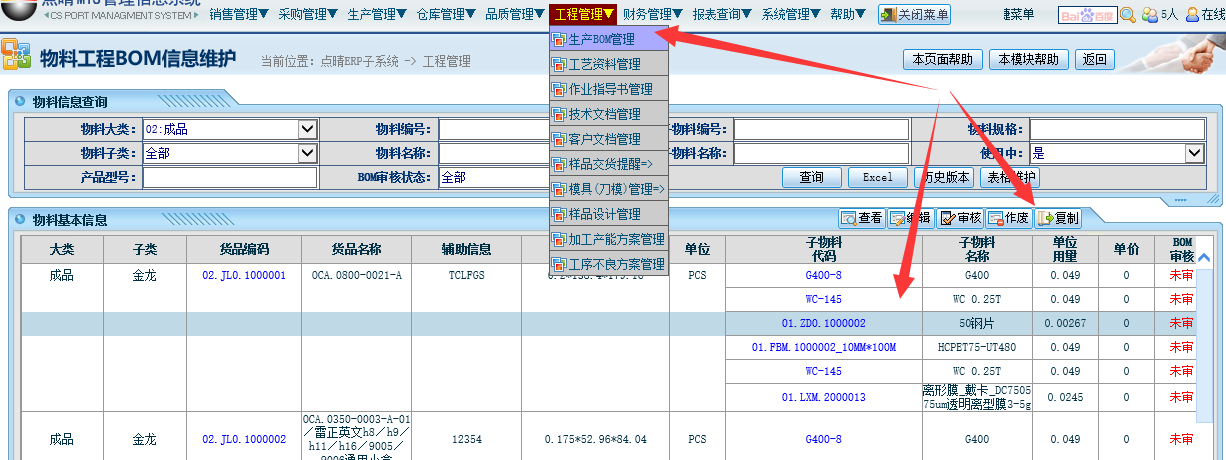 请问点晴模切ERP中是否有物料BOM和工艺资料复制功能?在哪里?