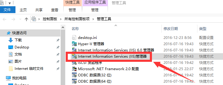 安装完成后,再次进入控制面板,选择“管理工具”,进入后双击 Internet(IIS)管理器选项,进入IIS设置。(注意是“ Internet(IIS)管理器”而不是“ Internet(IIS)6.0管理器)