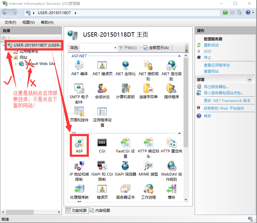 ![]() 1、点击"ASP"(注意是点击根目录,不是点击下面的网站):