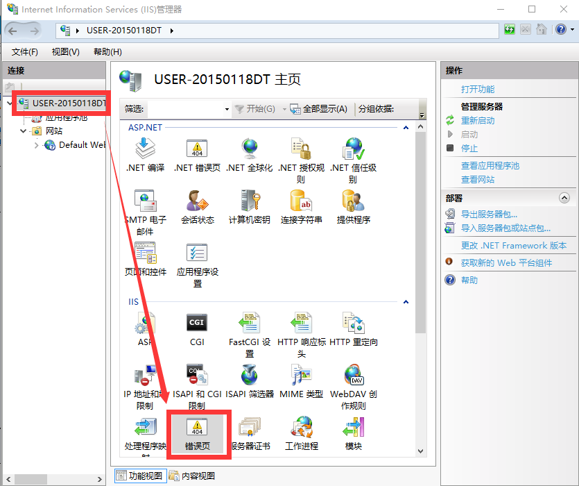 2、点击IIS管理器根目录-》错误页: