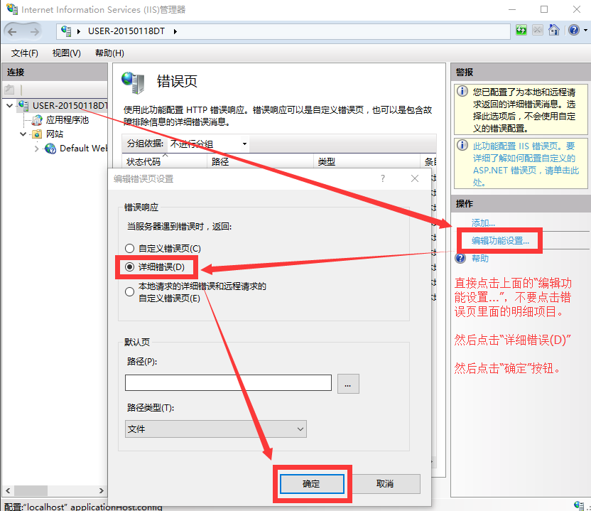 ![]() 双击“错误页”,在错误页设置页面中,不要点击明细内容项,直接点击右边的“编辑功能设置...”,在弹出的页面中,点击选中“详细错误(D)”,然后确定保存: