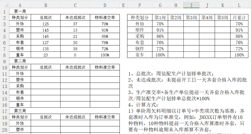 事后管理事后的管理就需要相当多的基础数据收集,如《物料欠料表》每天发布的话,需要统计采购部门各采购的承诺达成率、物料准时交付率、生产计划变更次数统计(因物料影响的);除了这些指标,还需要统计的就是物料异常数据库; 如何理解物料异常数据约束库呢?就是统计物料出现异常的真因是什么?如人为失误、品质问题、工艺问题、设计缺陷等,统计的越详细越好,这样当有返单过来,可以提前提醒采购人员,让采购人员知道这个物料经常会出现问题。以便采购有前置期来处理异常。