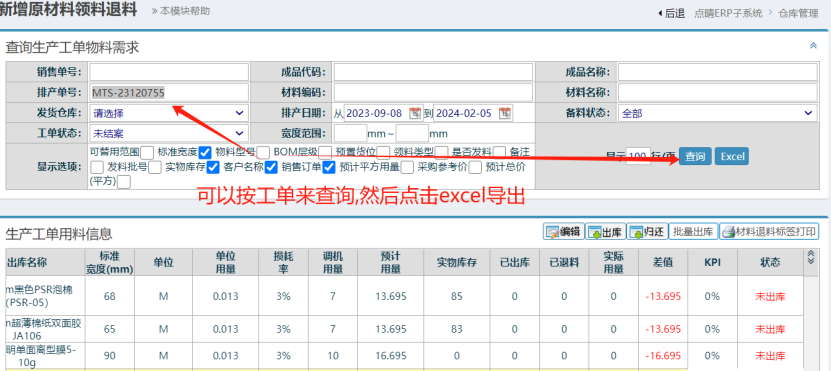 :点晴ERP-如何导出工单的领料情况![]() 点击进入 如下图: 按工单号查询后,然后点击EXCEL按钮 如下图: ![]() 点晴模切ERP更多信息:https://moqie.clicksun.cn,联系电话:4001861886 该文章在 2023/12/7 16:41:29 编辑过 |