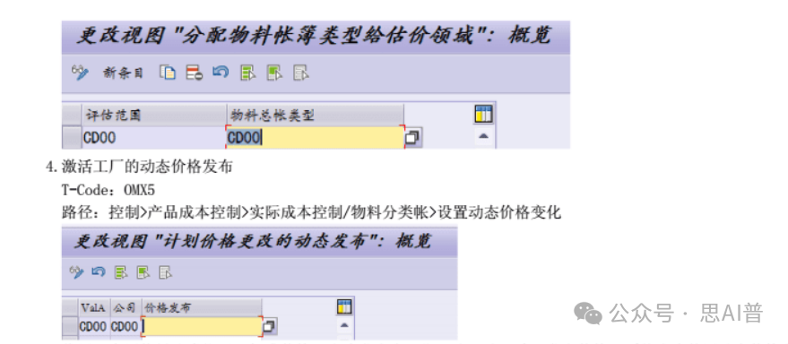 作用:启用物料分类帐后,标准价格只允许发布在下期,为了防止遗漏发布价格,系统允许使用动态价格发 布。举例说明:A物料在1月份标记价格,滚算日为2月1日。2月1日是没有通过CK24发布价格,如果启用动态价格发布,当2月1日后勤对A物料发生任何一笔产生会计凭证的业务时,会自动将新价格发布至2月1日,也就是说,在第一笔业务发生的时候,产生的会计凭证除了物料移动自身所对应的凭证外,同时会附带一张价格修改凭证。 注意:不建议激活动态价格发布,目前该功能存在 bug,激活后将可能导致物料在主数据下的标准价,与物料分类帐中的标准价不一致。 目前这个问题没有很好的解决方案,对于生产机,建议联系 SAP 直接改表,统一两边价格;对于测试机,可直接重置物料分类帐,并取消激活动态价格发布。 5.定义材料更新结构 T-Code: 0MX9 路径:控制>产品成本控制>实际成本控制/物料分类帐>物料更新>定义材料更新结构 剩余部分内容请自行下载查看: 备用链接: