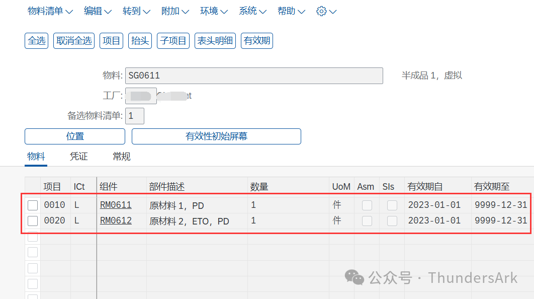 还是重复的步骤,进入到我们的【更改物料BOM:通用项目总览】屏幕,还是同一个物料,不过这次我们将先前的虚拟物料换为了一个实体物料,如下图所示: