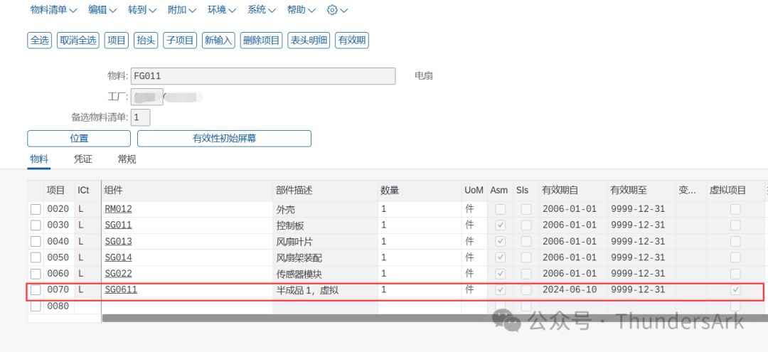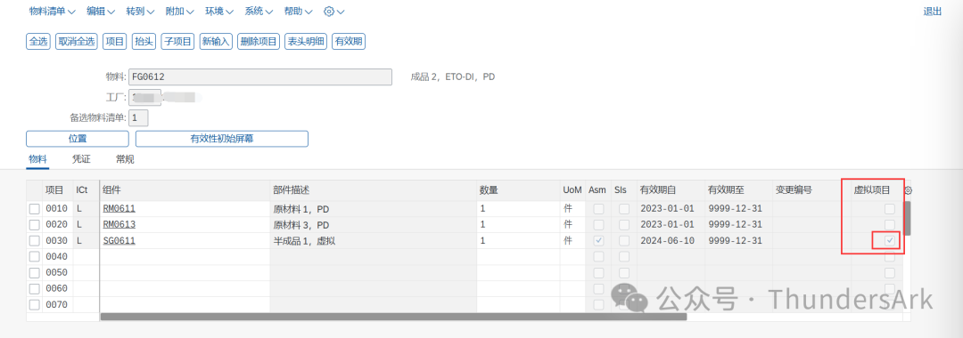 在BOM物料清单中,被设置为虚拟物料的半成品的虚拟项目将被默认打上勾且不可更改。