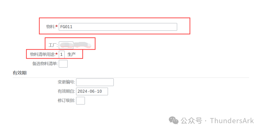 输入【T-CODE:CS02】进入【更改物料BOM:初始屏幕】,输入物料和对应的工厂以及物料清单用途。