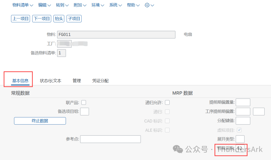 接着, 我们单击行项目进入【更改物料BOM:项目:所有数据】屏幕,在【基本信息】栏目最下方特殊采购字段中输入52直接生产/汇总订单。