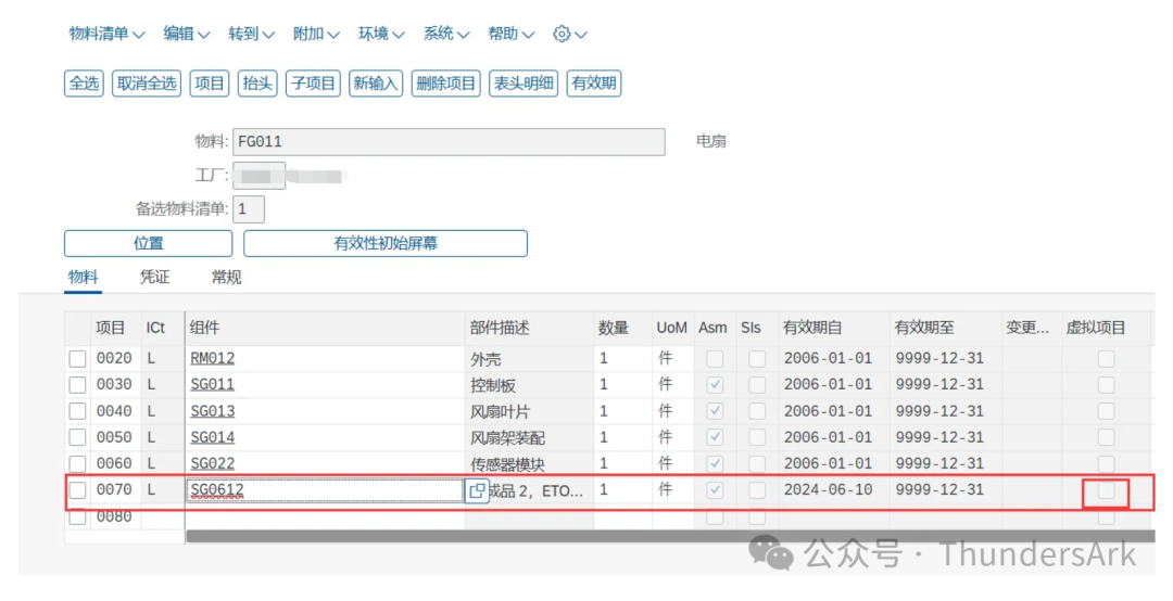 重新返回【更改物料BOM:通用项目总览】,可以看到我们的实体件的虚拟项目默认进行了勾选。