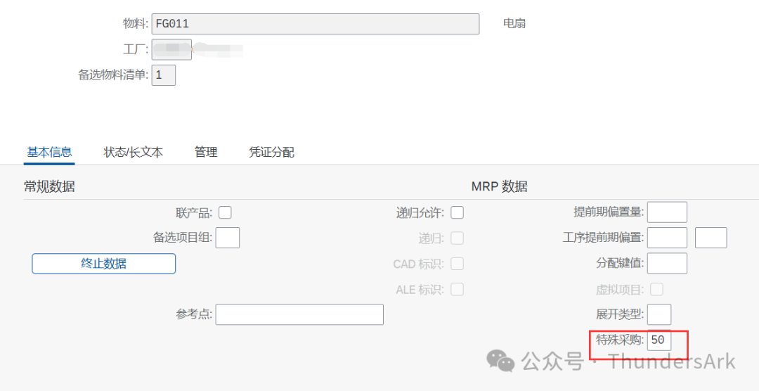 若想将一个物料设置为虚拟物料,我们需要在该物料的MRP2视图中将其采购类型设置为E,特殊采购类型设置为50,如下图所示: