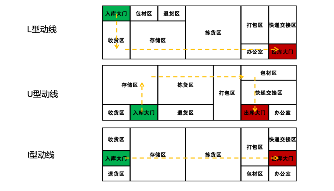1、L型动线 可以应对进出货高峰同时发生的情况;适合越库作业的进行;可同时处理“快流”及“慢流”的货物。 2、U型动线 出入口在仓库的同侧,根据进出货频率大小,将流量大的商品安排在靠近进出口端的存储区,缩短商品的拣货搬运路线。 3、I型动线 出入口在仓库的相对面,无论订单大小与拣货品相多少,均要通过仓库全程,适合作业流程简单、规模较小的作业。