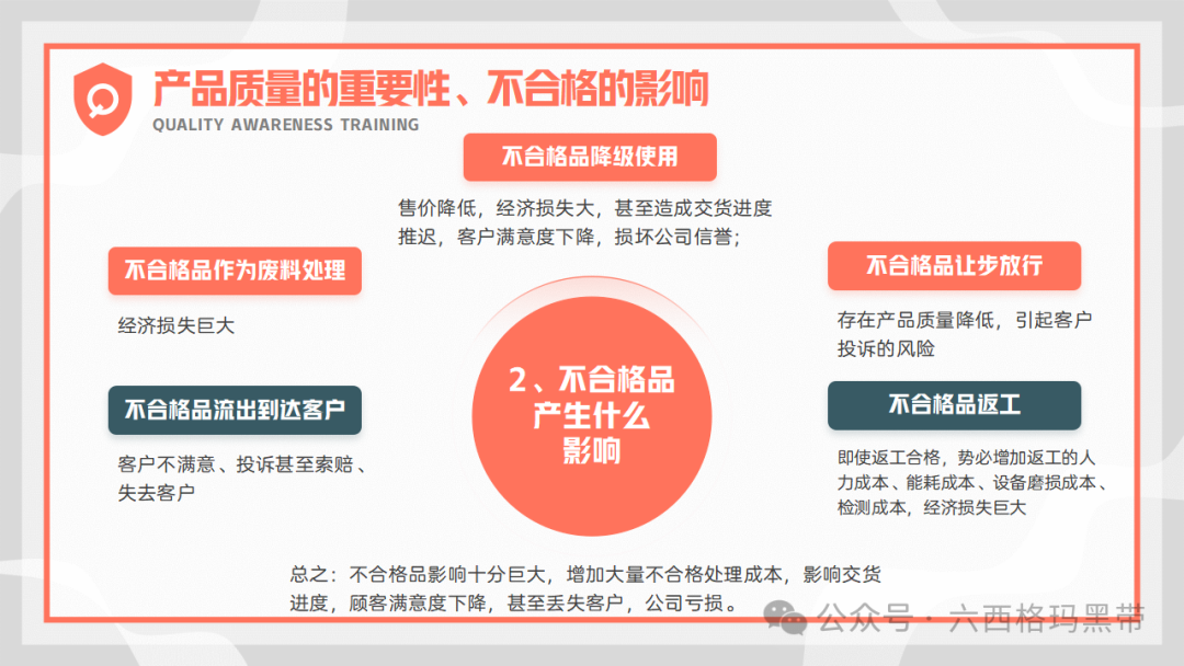 产品质量的重要性不合格品的影响产品质量是企业生存和发展的基石,不合格品的出现不仅会直接影响顾客的满意度,导致企业形象受损,还可能引发一系列连锁反应,最终造成公司亏损。不合格品会增加企业的处理成本,包括返工、报废、赔偿等费用,同时还会影响交货进度,破坏与客户的合作关系,甚至可能因违约而面临法律诉讼。因此,严格控制产品质量,避免不合格品的产生,是企业质量管理工作的重中之重。 避免不合格品的产生明确产品质量是生产出来的,不是检验出来的这一观念强调了生产过程控制的重要性。检验只是对产品质量的验证手段,而真正的质量是在生产过程中形成的。因此,企业必须重视生产过程的每一个环节,确保每个环节都符合质量标准。 控制生产过程中的六因素为了有效避免不合格品的产生,企业需要严格控制生产过程中的六大因素:人(操作人员)、机(设备)、料(原材料)、法(工艺方法)、环(环境)、测(测量)。通过加强对这些因素的监控和管理,可以及时发现并纠正潜在的质量问题,确保产品质量的稳定性。 如何做出品质合格的产品零缺陷原则和三不原则零缺陷原则零缺陷原则强调“第一次就把事情做好”,即要求员工在生产过程中严格遵守质量标准,确保每个环节都不出错。这一原则要求员工具备高度的责任心和敬业精神,以零缺陷为目标,不断提升自己的技能水平。 三不原则三不原则包括:不接收不合格来料、不生产不合格品、不合格产品不向下工序流转。这一原则要求员工在生产过程中严格把关,对不合格品进行及时拦截和处理,防止不合格品流入下一道工序或市场。 执行方法和作业依据为了确保产品质量的合格性,企业需要制定详细的执行方法和作业依据。在生产准备阶段,员工应先检查来料是否符合质量要求;在生产操作过程中,应严格按照作业指导书、工艺标准和检验规范执行;生产完毕后,应对产品进行全面的检查,确保产品合格后方可流转至下一道工序。 三不原则的实施为了有效实施三不原则,企业需要加强员工的质量意识培训,让员工明确自己的职责和义务。同时,企业还需要建立健全的质量管理制度和监督检查机制,对生产过程中的每一个环节进行严格的监控和管理。具体来说: