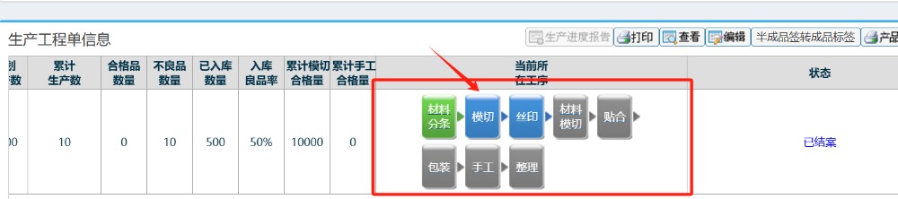 操作步骤:生产管理-生产进度汇报 找到对应的单据,点击工艺进入到汇报界面,如下图所示: