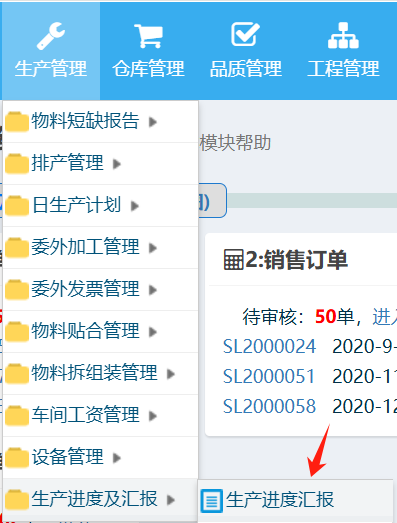 操作步骤:生产管理-生产进度及汇报-生产进度汇报,如下图所示: