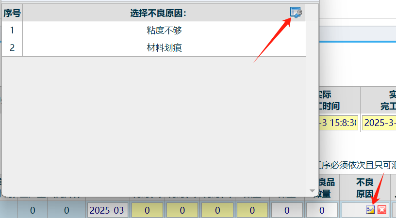 进入界面后,点击不良原因对应图标,弹出窗口,在弹窗界面点击设置图标,如下图所示: