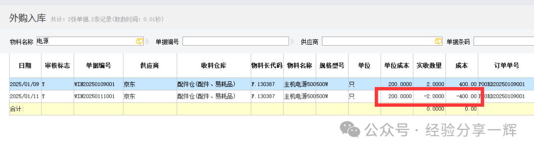 我们再查外购入库单,系统就有一张(负数的单据)
