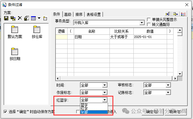 查询时新手们要注意一个点,红蓝字这里要选(全部),之前我查退货单据时老是查询不到,后面才知道是因为这里选了(蓝色),所以用什么条件来查都查不到退货的单据。