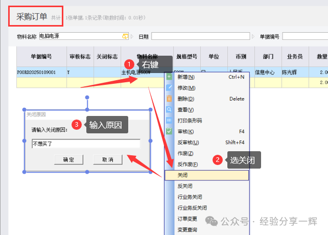 03:不买了(关闭单据,结束流程)操作 在(采购订单维护)里面,找到我们的单据,右键选择(关闭),输入关闭原因。
