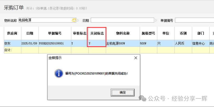 关闭成功后,此时单据的关闭标志为(Y),单据流程结束。