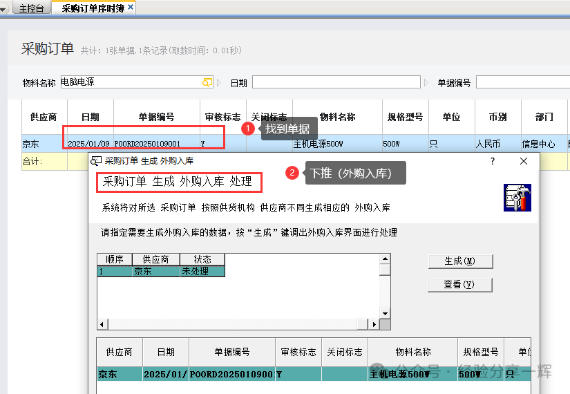 点(生成),系统自动关联单据生成(红字的外购入库单)