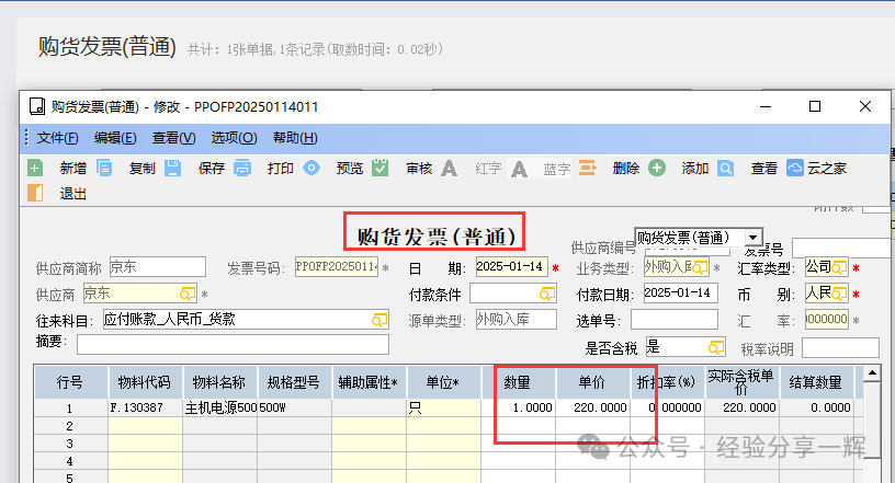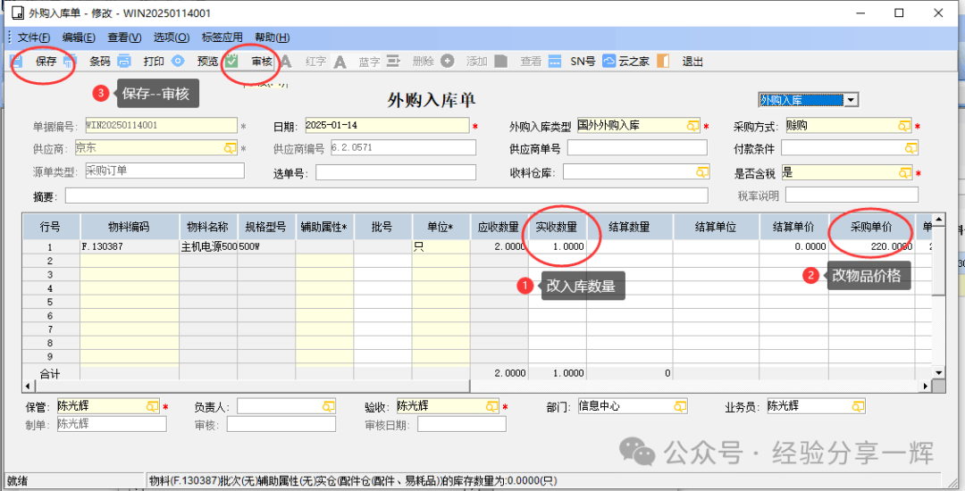 因这次只买一个,价格为220元,外购入库单关联采购订单后,要改入库数量和采购单价,并保存审核。
