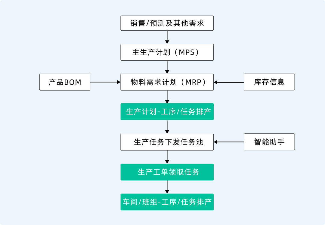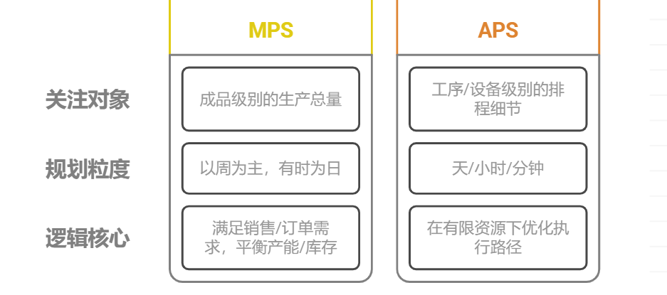 特点: 颗粒度细,排程精度高(可精确到小时/分钟); 以设备、工序、资源为单位安排生产; 强调“资源约束+物料+订单”三者协同。