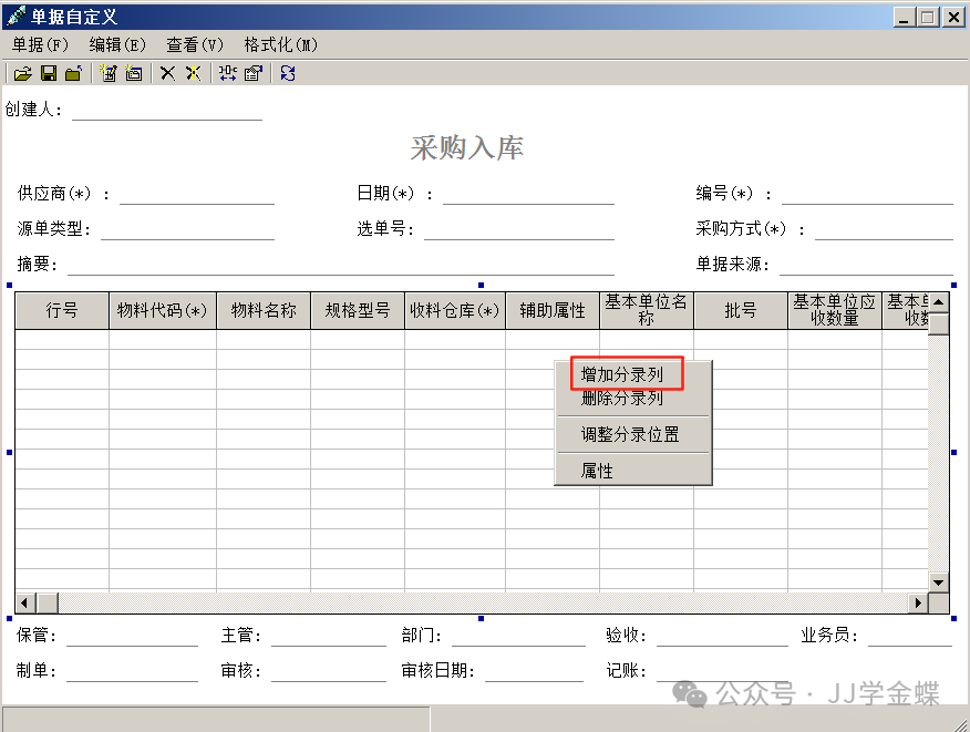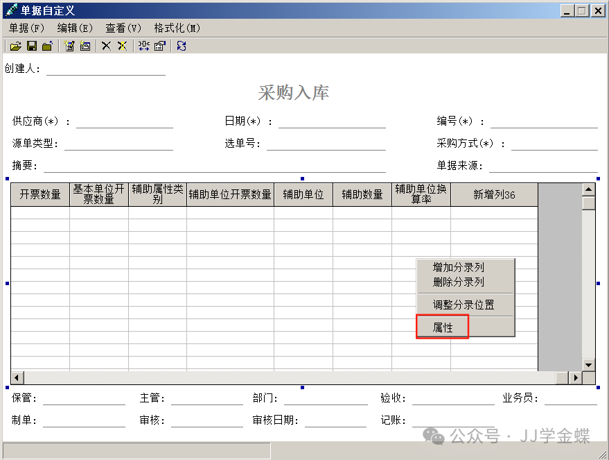 5、接下来我们设置新增分录列的属性(名称及取数来源); a、在采购入库单表体鼠标右键点击“属性”,找到新增的分录列;