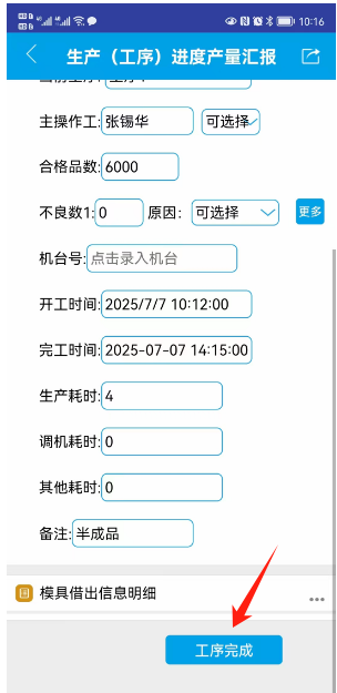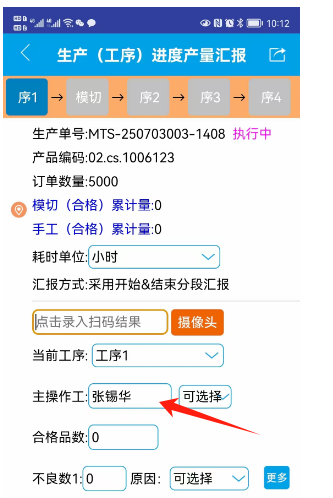 注意:开始计时汇报,无需填写数量,机台等信息 操作完后,等工序完成,重复操作上述步骤再次进入界面