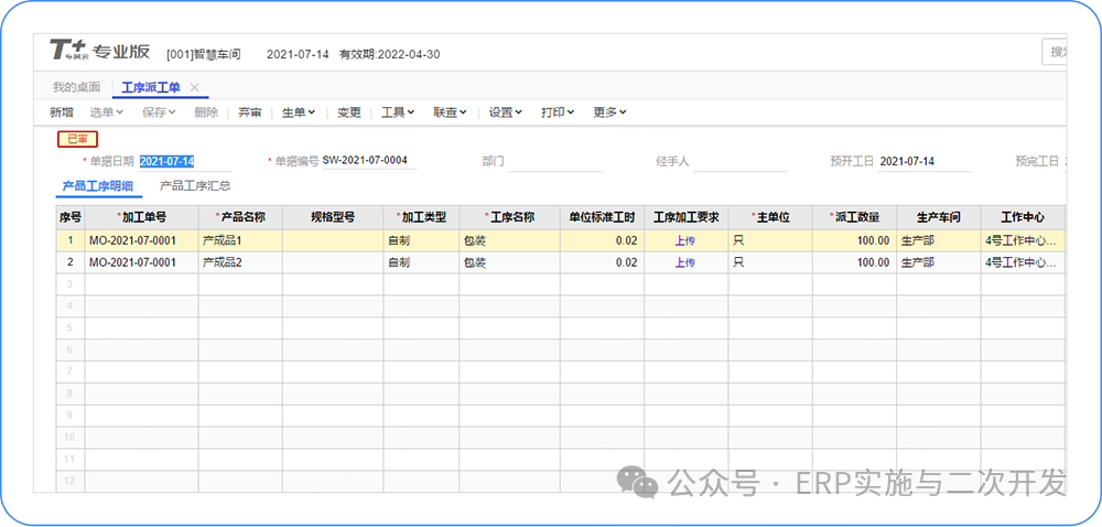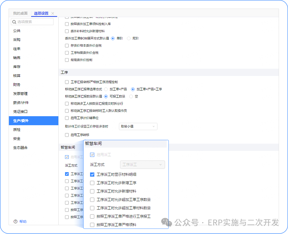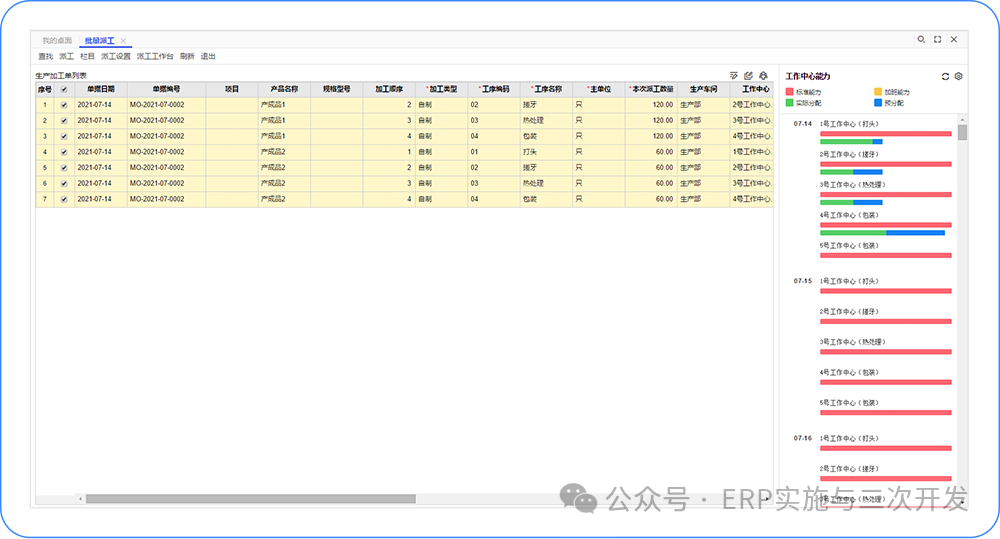 3支持批量派工,可以把需要派工的任务批量的派工到相应的工作中心。派工时可以看到各工作中心可以提供的能力、已经安排的任务以及本次任务安排后能力的情况 4支持派工工作台,通过列表+甘特图的形式展示已经安排的各工序的任务,方便调整和查看 5支持工人作业工作台。可查看工人的作业任务、图纸、工艺要求等信息,并进行领料、开工、完工等业务处理 具体操作步骤: 1 选项中勾上派工相关参数