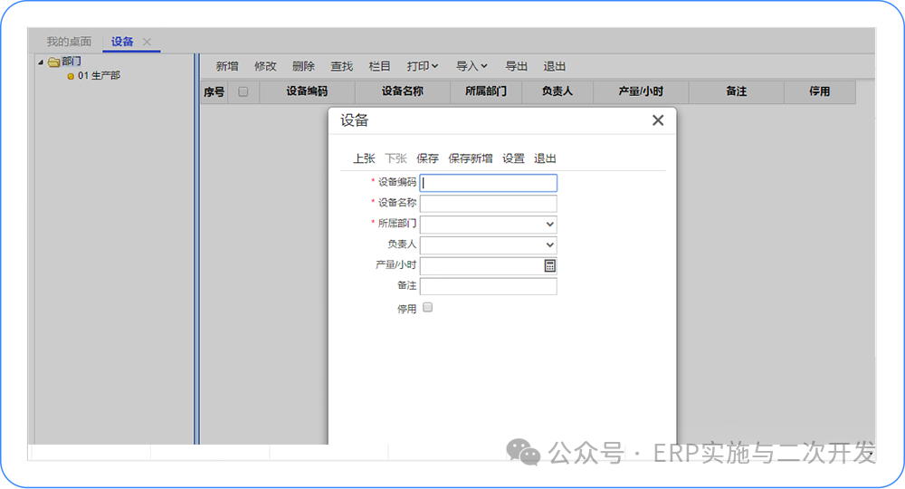 3 设备可设置工厂用于生产的设备信息,可设置设备每小时的产量,当设备属于某个工作中心时,会默认把产量带到工作中心中