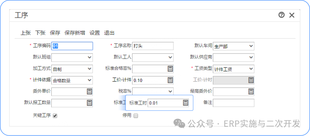 5工序档案、工艺路线、物料清单、加工单工序明细增加标准工时,标准工时可以带入到工序派工单上,工序派工时根据标准工时计算需要的产能的情况。注:目前不支持设置工时单位,默认按小时。这四个档案的设置均是默认设置,最终计算时以工序派工单的单位标准工时为准