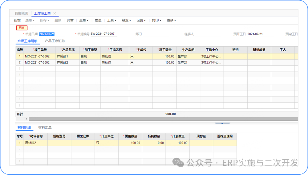 6 可以进行工序派工,派工时可以根据选项设置是否显示材料明细。显示材料明细时,工序派工单有工序明细时,需要按工序派工单领料,不带入工序派工单的材料明细,可以按加工单领料。加工单的一行材料明细只能生成工序派工单再领料或者由加工单生成采购出库单