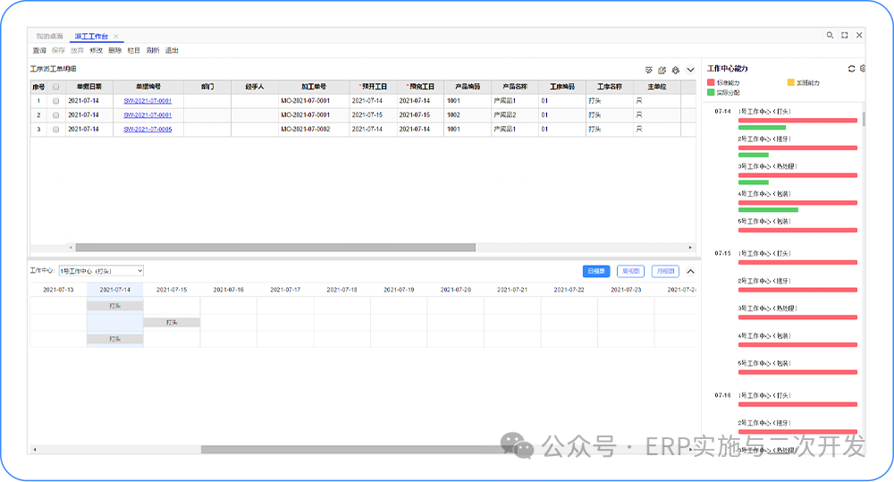 8 派工工作台显示任务列表+甘特图+能力情况。可在任务列表快速修改任务的预开工、预完工日期调整任务安排,也可以通过甘特图的拖拽调整任务安排。调整完成后,刷新能力,可实时看到调整完的能力情况。