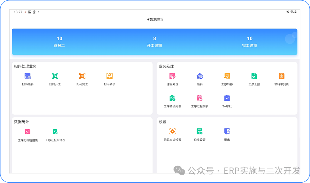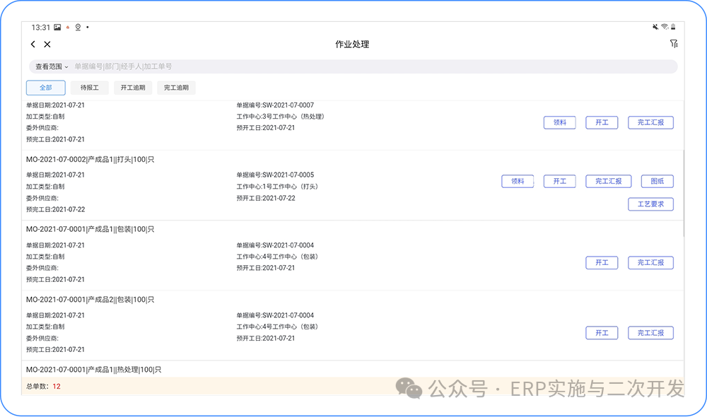 支持有限产能排产视图和无限产能排产视图 9 工人工作台 工人作业的工作台,可以显示工人待处理的任务、查看图纸、工艺要求,可以进行领料、开工、完工等业务处理,也可进行数据查询 可以到工序派工单的条码进行领料、开工、完工的处理 支持安卓版的手机、平板、工控一体机
