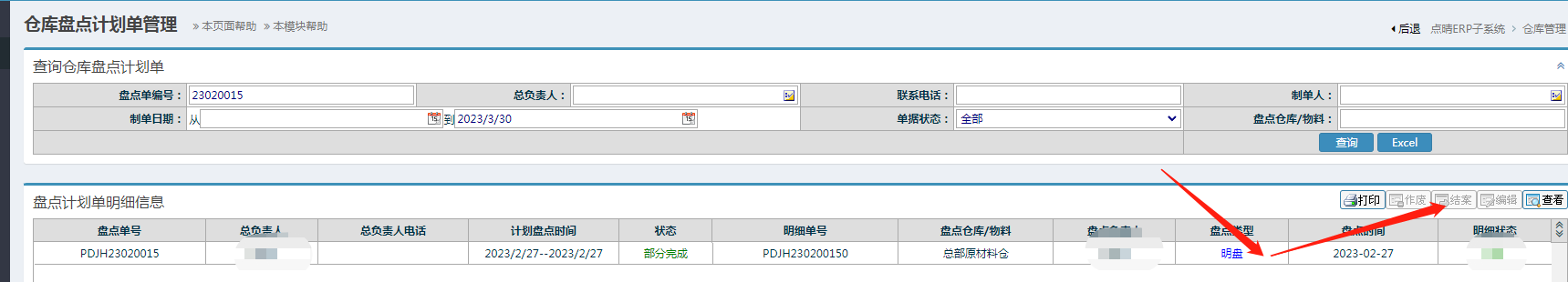 仓库管理-物料盘点管理-盘点计划单管理 进入界面后,用对应单号搜索(如上图的PDJH23020015,注意尾号0不用输),选择对应的单据,点击结案按钮 点晴模切ERP更多信息:https://moqie.clicksun.cn,联系电话:4001861886 该文章在 2025/7/11 10:38:53 编辑过 |