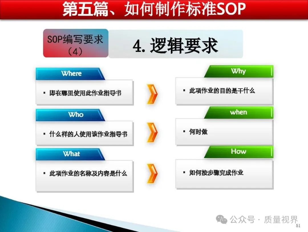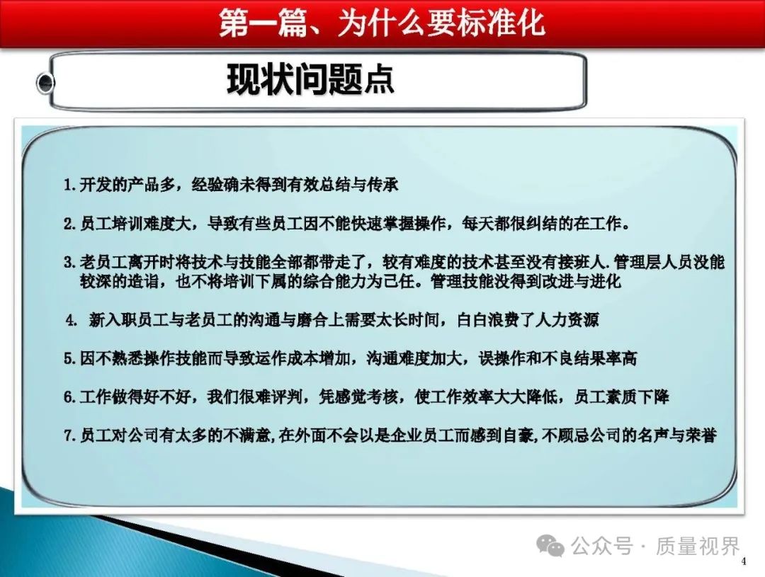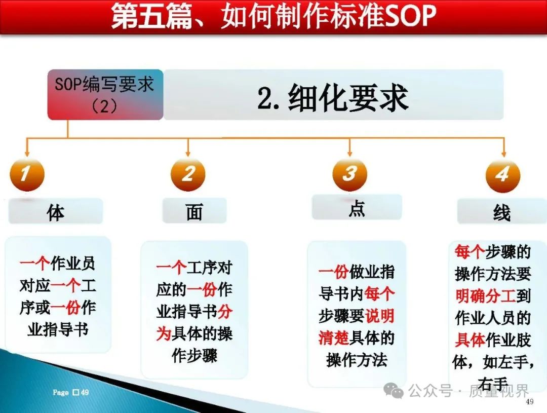 SOP 的本质是什么? SOP(Standard Operating Procedure,标准作业程序)的本质是将重复性工作的最佳实践转化为可执行、可追溯的标准化流程。它不是简单的 “操作步骤清单”,而是对工作逻辑的系统性梳理 —— 包含 “做什么(目标)、怎么做(步骤)、谁来做(责任)、用什么做(工具)、注意什么(风险)” 等核心要素,本质上是组织经验的固化与传承载体。 为什么要标准化? 标准化(包括 SOP 的落地)的核心目的是解决 “不确定性” 带来的效率损耗与风险,具体可从 3 个维度理解: 1. 对 “执行层”:降低操作门槛,减少失误