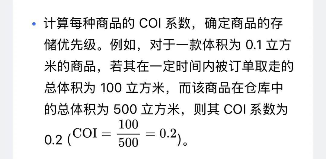 (二)基于 COI 系数的库位分配 根据 COI 系数的大小,可以将货物分为高、中、低三个等级。高 COI 系数的货物通常被频繁订购,应存放在靠近出口或易于访问的位置,以便快速分拣和配送。中 COI 系数的货物可以存放在中间区域,而低 COI 系数的货物则可以存放在较远的位置。 例如,在一个电商配送中心,通过分析历史订单数据,发现某款热门电子产品(如智能手机)的 COI 系数较高。因此,该产品被优先存放在靠近发货区的货架上,以便快速响应订单。而对于一些低 COI 系数的商品(如季节性商品),则可以存放在仓库的较远区域,以节省空间。 基于 COI 系数的库位分配方法能够有效优化货物的存储布局,提升仓储作业的整体效率。以下是该方法的进一步阐述及其在实际应用中的优势和实施步骤。 (三)基于 COI 系数的库位分配方法的优势 1. 优化存储布局:通过将高频次订单商品放置在易于存取的位置,减少了拣货员的行走距离,从而显著提高了拣货效率。 2. 降低仓储成本:合理利用仓储空间,避免了因货物存放不合理导致的空间浪费,降低了仓储成本。 3. 提高库存周转率:高 COI 系数的商品通常具有较高的库存周转率,将其放置在靠近出口的位置,可以加快货物的周转速度,减少库存积压。 4. 增强客户满意度:快速响应订单需求,缩短配送时间,从而提高客户的满意度和忠诚度。 (四)基于 COI 系数的库位分配实施步骤 1. 数据收集与分析 • 收集历史订单数据,包括订单中每种商品的订购频率、订购数量以及商品的体积等信息。