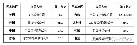 第一部分“箱主、经营人信息”,由3位英文字母组成,一般是箱主自己规定,并向国际集装箱局登记。我国箱主信息通常采用汉语拼音字母表示,如铁道部为TB、交通部为JT、外贸部为WM,所以上边的箱子一看“TBJ”就知道铁道部的集装箱。 第二部分“设备识别代码”,单个英文字母,说明集装箱的类型。像“U”表示常规所有集装箱代号,“J”表示带有可拆卸设备的集装箱,“Z”表示集装箱的拖车和底盘车。 这里要注意下,第一部分+第二部分组合起来也叫“箱主代码”,也整理了些其他公司及其代码参考: