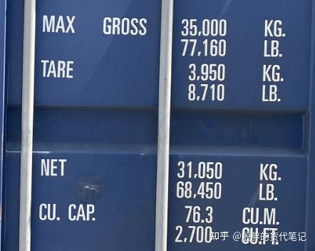 用前两位进行集装箱的区分,第一位开头数字为2的代表20英尺柜型,为4的代表40英尺柜型,为L的代表45英尺柜型。第二位数字为2的是非高箱(8.5英尺高);为5的是高箱(9.5英尺高)。 另外要特别注意,第二位为5并不代表45英尺,如上图所示95代码45G1其实是指40尺高箱,这个极易让人误以为是45尺高箱。 之前发过一篇关于集装箱尺寸的文章,想拓展学习的朋友可自行跳转《常用的集装箱知识汇总,看这篇就够了!》 3.重量容积标记