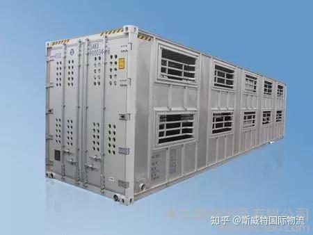 ![]() 框架集装箱(flat rack container)没有箱顶和两侧,其特点是从集装箱侧面进行装卸。以超重货物为主要运载对象,还便于装载牲畜,以及诸如钢材之类可以免除外包装的裸装货。还可以便于大型超宽,超高货物的吊装。 5牲畜集装箱