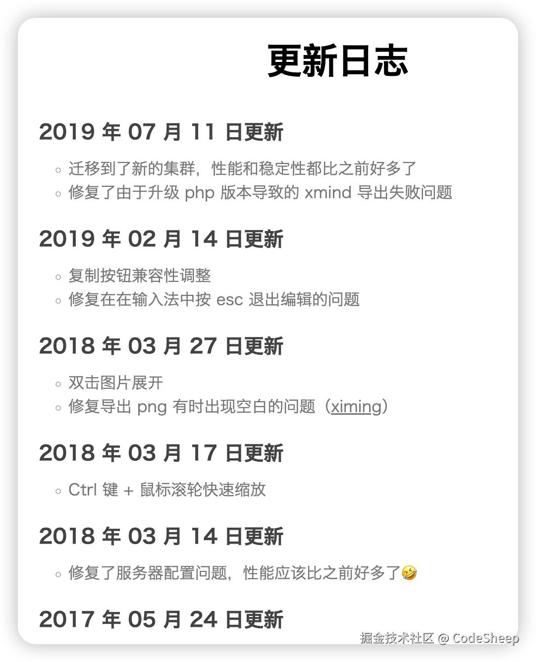 我特地看了一下它的产品更新日志,最近的一次更新还得追溯到 2019 年的 7月份。