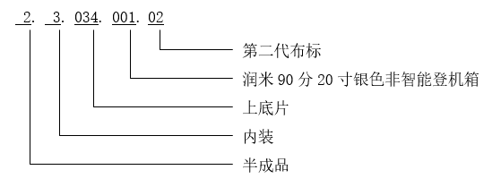 例:物料代码“02.03.034.001.02”代表“润米90分20寸银色非智能登机箱 上底片 (第二代布标)”。
