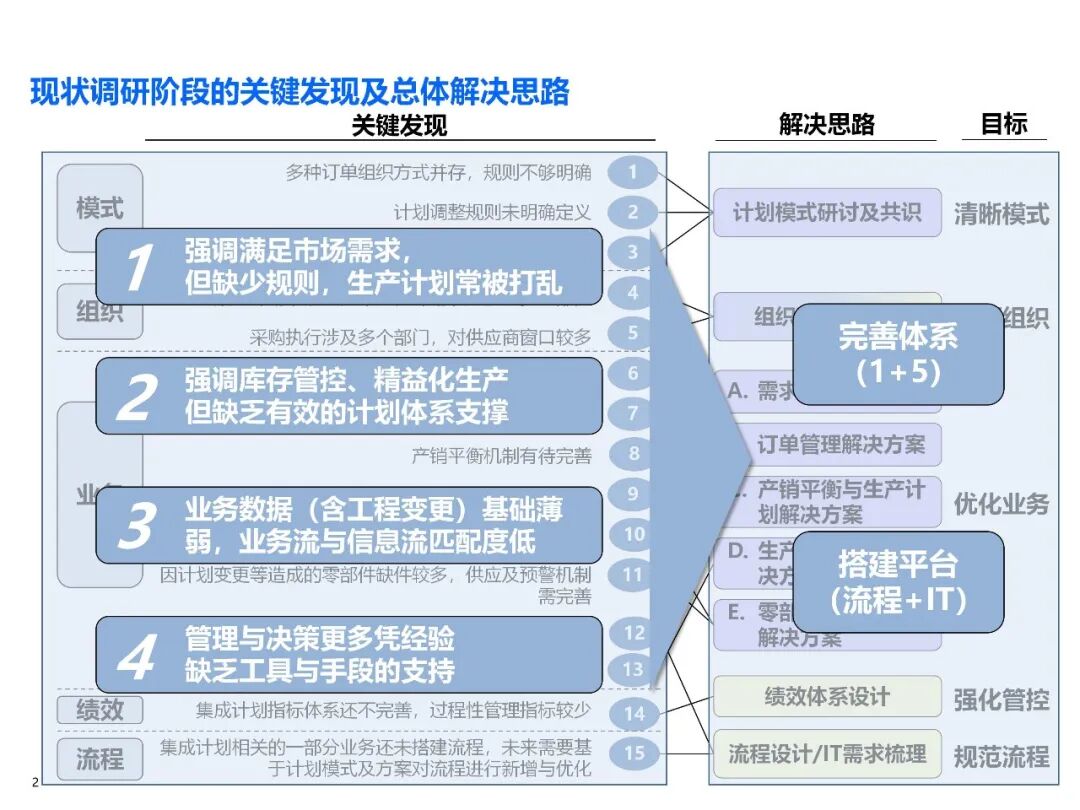 - 产销协同不足:需求计划准确率低,对生产和采购指导性弱,缺件问题频发,工程变更信息传递不及时;
