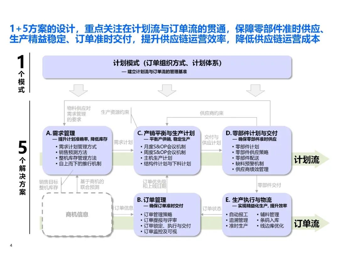 三一的解决方案以 “打通计划流与订单流” 为核心,构建 “1 个计划模式 + 5 大业务解决方案” 的 “1+5” 集成体系,形成 “规则 + 承诺、柔性 + 例外” 的供应链管理基准。
