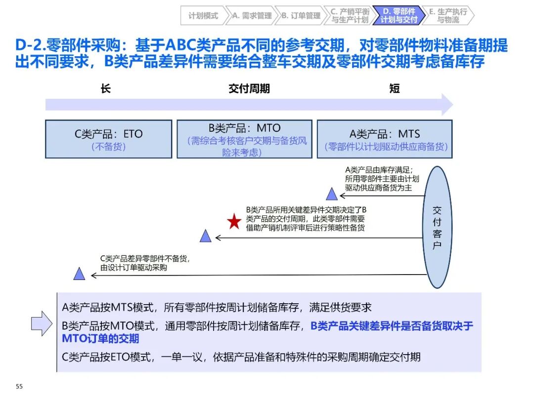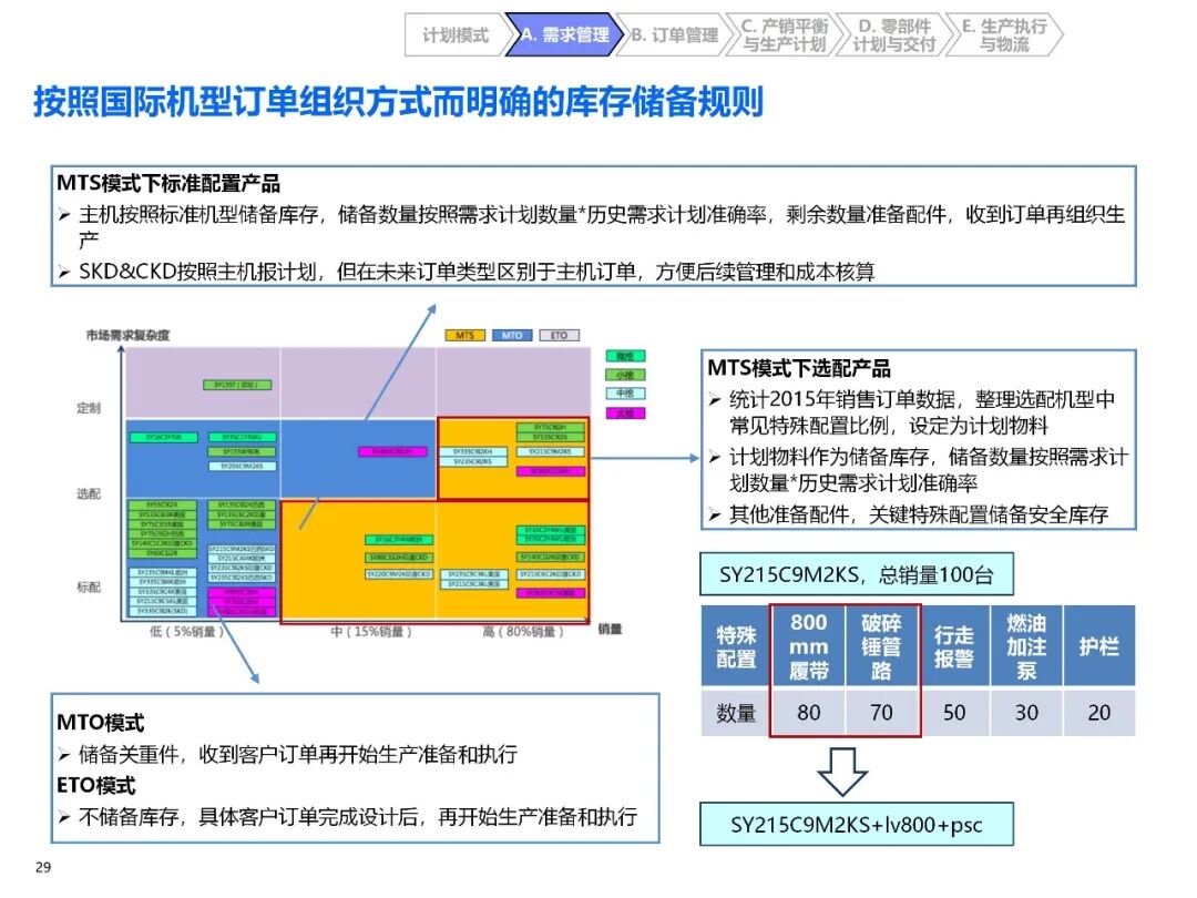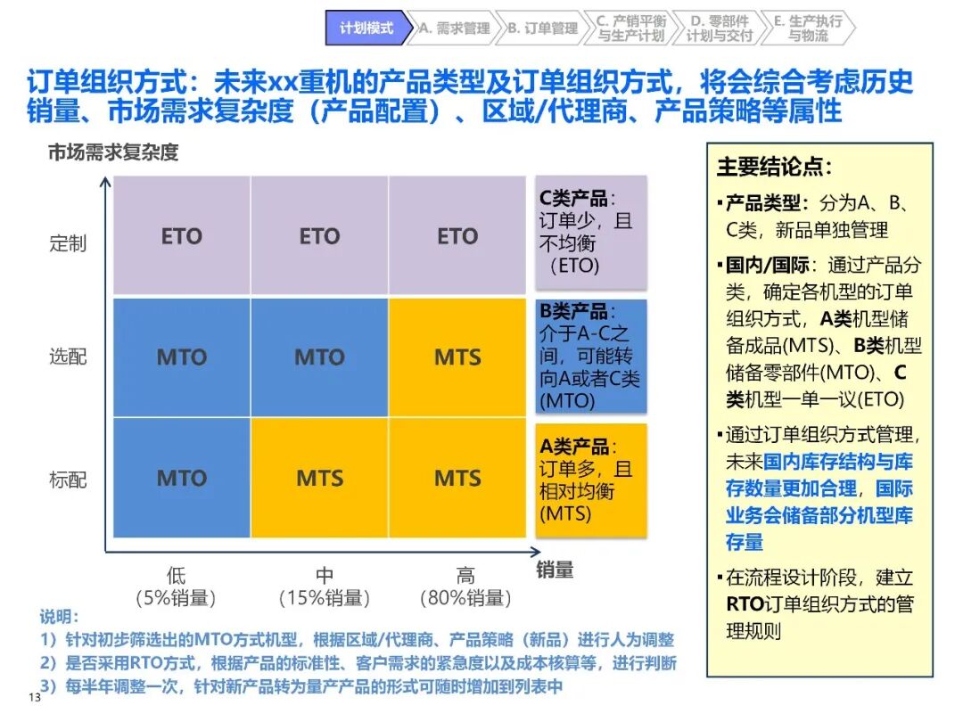 - 混合订单组织方式:根据产品销量、市场需求复杂度,将产品分为 A(高销量标配)、B(中销量选配)、C(低销量定制)三类,对应 MTS(按预测生产)、MTO(按订单生产)、ETO(按设计生产)模式,同时兼容 RTO(紧急订单改装),明确各类订单的库存策略和交付规则;