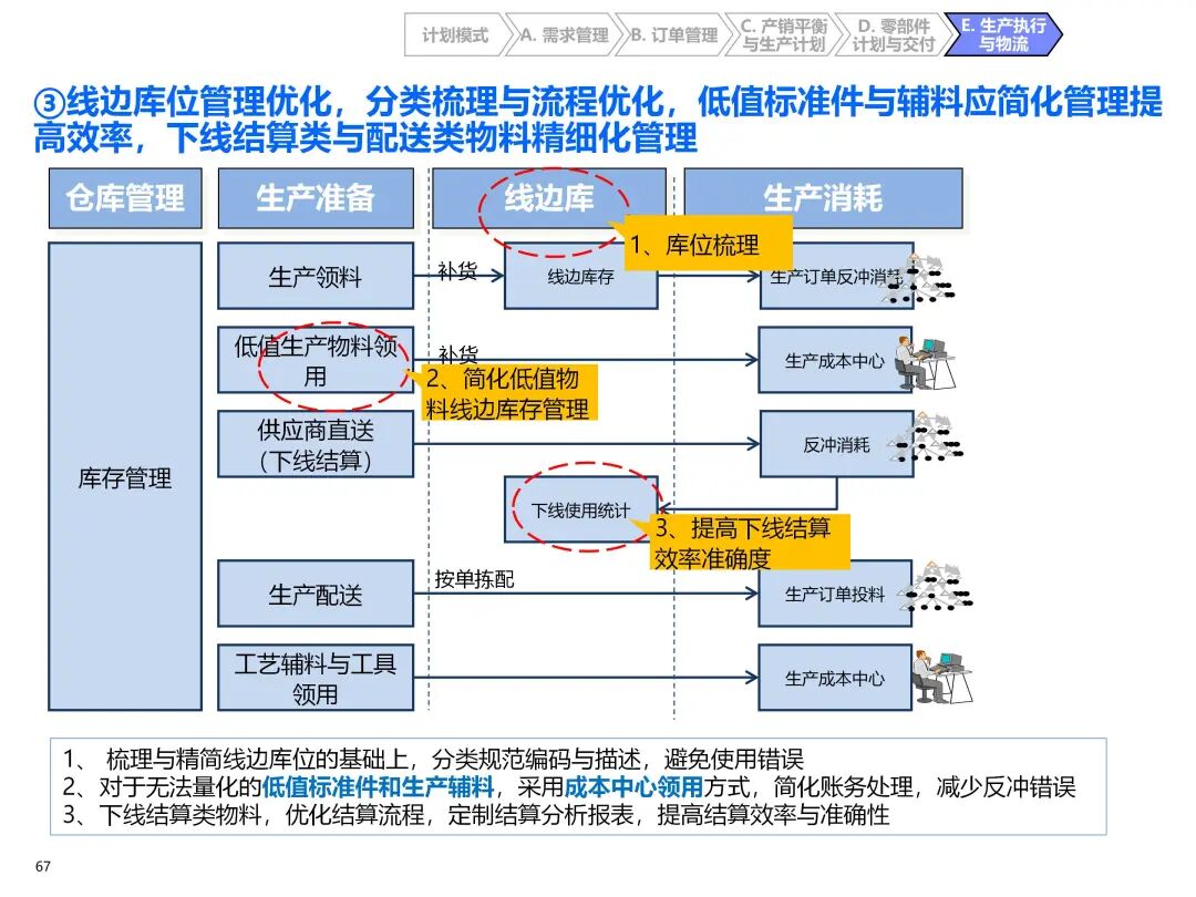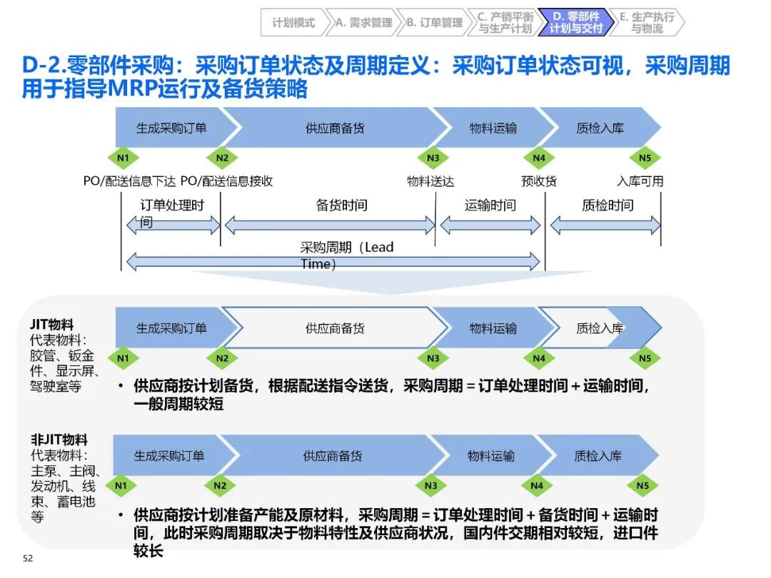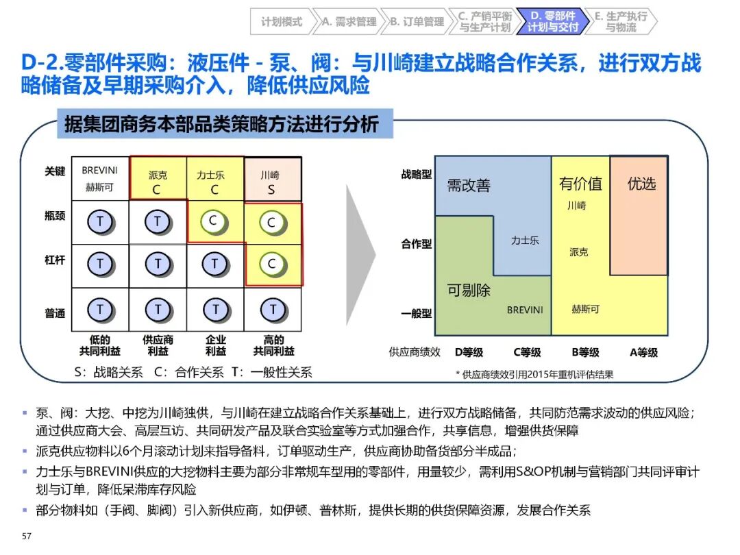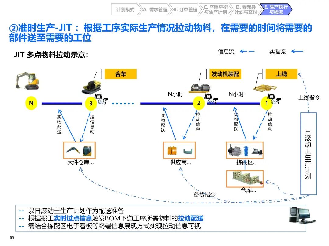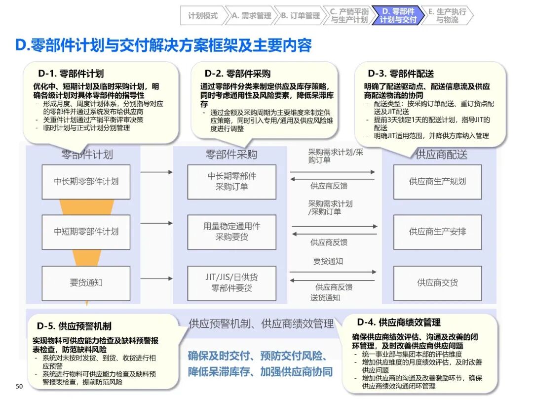 - 零部件分类供应:按采购金额、周期、通用性分为 ABC 三类,制定差异化库存策略(如 A 类关重件战略储备,C 类低值件 JIT 配送);