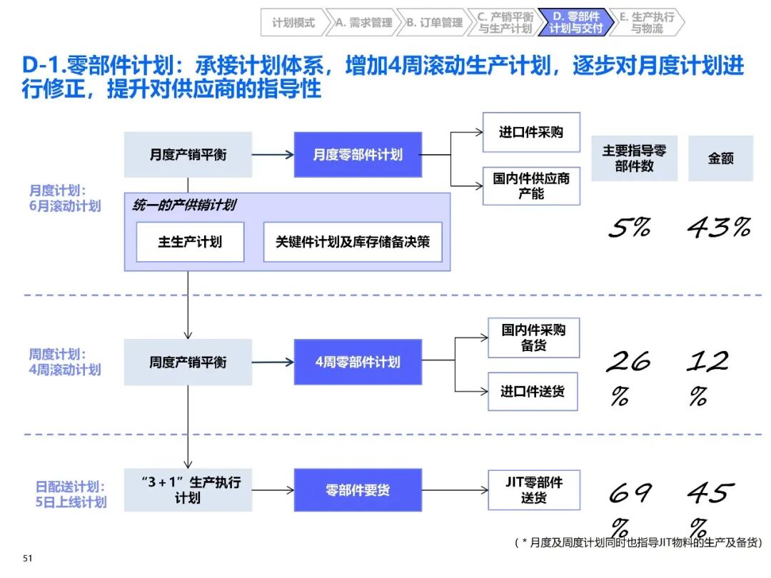 - 三级滚动计划体系:优化为 “6 月月滚动(A 表)+4 周周滚动(C 表)+3+1 日滚动”,去除作用不明显的 B 表,提前 3 天锁定次日生产计划,既保障供应商备货时间,又提升市场应变能力;