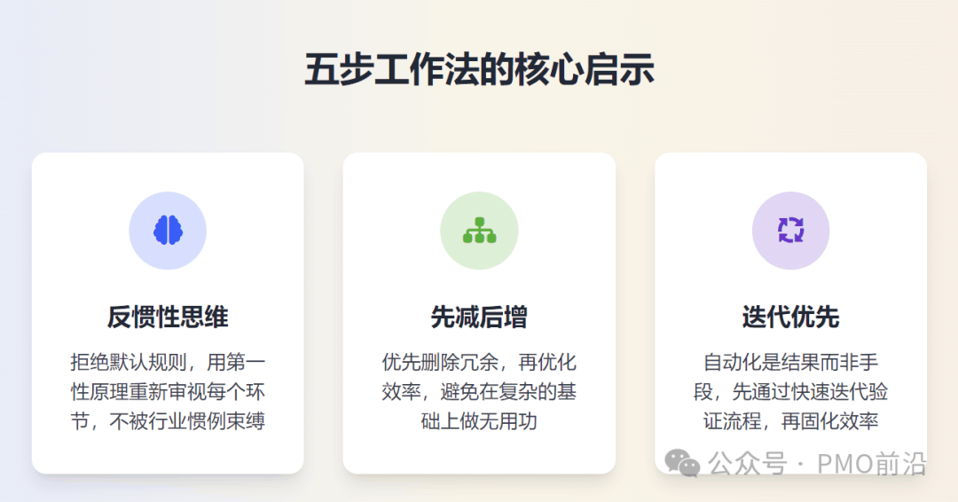 站在组织高度看,马斯克五步法的本质,是一套防止项目生态失衡的免疫机制:当所有项目都围绕真实需求、轻装上阵、快速反馈、有序协同——内耗自然消解,增长水到渠成。治项目内耗,不在管控,而在设计一套让好项目自然胜出、坏项目自动淘汰的组织机制。
